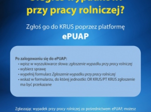 Kasa Rolniczego Ubezpieczenia Społecznego informuje, że udostępniła na platformie ePUAP usługę Zgłoszenie wypadku przy pracy rolniczej co ułatwi zgłaszanie wypadku przy pracy rolniczej oraz składanie wniosku SR-23 o jednorazowe odszkodowanie z tytułu stałego lub długotrwałego uszczerbku na...