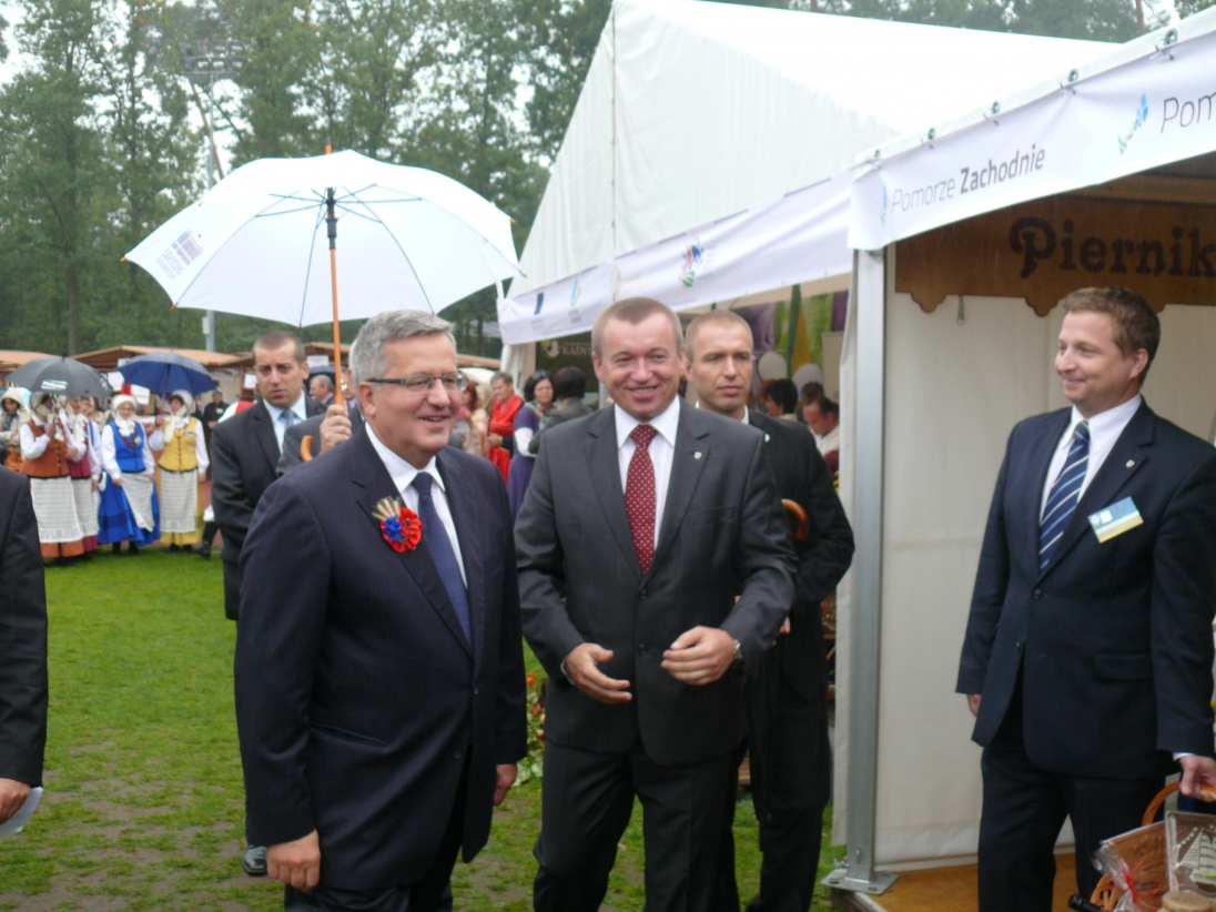 Województwo Zachodniopomorskie wystawiło też swoje stoisko promocyjne w ramach Miasteczka Regionów. Prezentowano w nim produkty kulinarne z naszego województwa. Celem prezentacji było przybliżenie osobom odwiedzającym dożynki dziedzictwa kulinarnego Pomorza Zachodniego oraz upowszechnienie wiedzy o tradycyjnych metodach wyrobu produktów. Osoby odwiedzające stoisko miały okazję skosztować m.in. pierników szczeciński, produktów ekologicznych, wyrobów z róży fałdzistolistnej czy konfitury z pomidorów. Długa kolejka odwiedzających ustawiała się po pstrąga wędzonego z gospodarstwa rybackiego "Zielenica" Anny i Łukasza Skowrońskich. Niewątpliwą atrakcją niedzielnego przedpołudnia był pieczony dzik nadziewany kaszą podany w asyście hejnalistów prezentujących sygnały łowieckie. Prezentację dzika oglądał odwiedzający stoisko Województwa Prezydent Rzeczpospolitej Polskiej Bronisław Komorowski, którego w imieniu Zarządu Województwa powitał Członek zarządu Jarosław Rzepa. Natomiast w sobotę stoisko naszego regionu odwiedziła Prezydentowa Anna Komorowska.