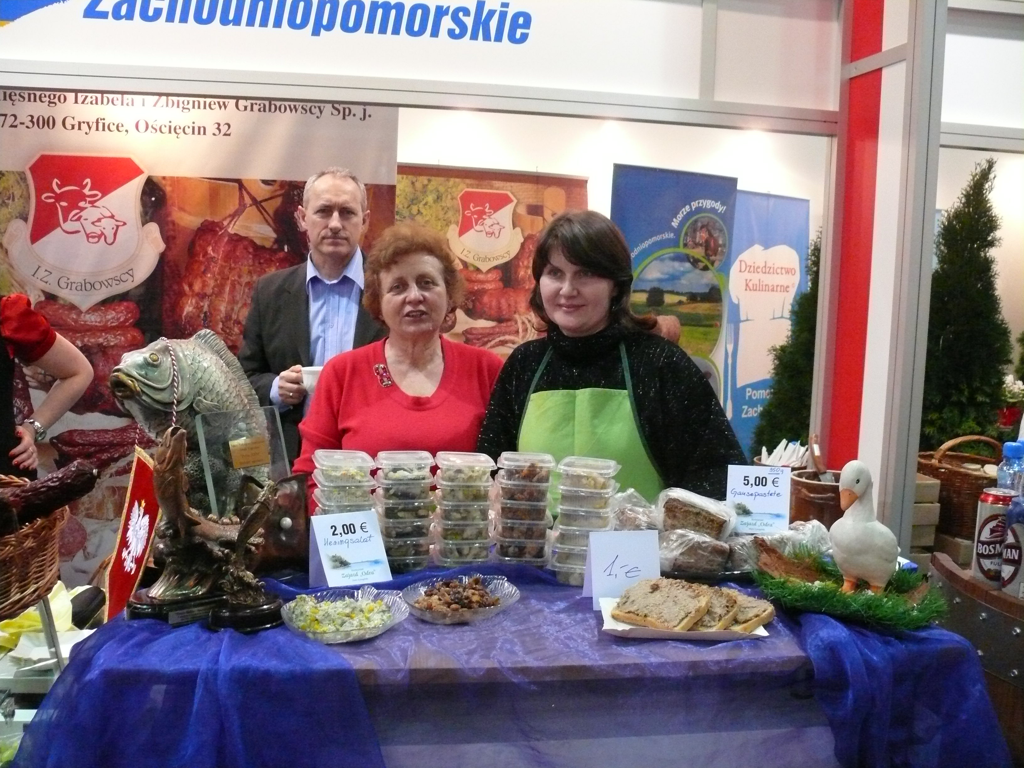 W dniach 15-24.01.2010 r. w Berlinie odbyły się 75. Międzynarodowe Targi Rolno-Spożywcze Grüne Woche. Organizatorem targów było Messe Berlin GmbH. Grune Woche jest jedyną w swoim rodzaju międzynarodową wystawą gospodarki żywnościowej, rolnictwa i ogrodnictwa. Dla producentów artykułów spożywczych i używek z całego świata, targi te są doskonałym rynkiem zbytu i stanowią możliwość sprawdzenia popytu na swoje produkty. Reprezentantami Polski obok Województwa Zachodniopomorskiego były m.in.: Ministerstwo Rolnictwa i Rozwoju Wsi, Województwo Kujawsko-Pomorskie, Lubuskie, Wielkopolskie, Łódzkie, Dolnośląskie oraz Opolskie. W czasie trwania targów ekspozycję Województwa Zachodniopomorskiego odwiedził Wicemarszałek Województwa Zachodniopomorskiego Jan Krawczuk, członek Zarządu Województwa Zachodniopomorskiego Marek Hok, Przewodniczący Komisji Rolnictwa i Rozwoju Obszarów Wiejskich Sejmiku Województwa Zachodniopomorskiego Piotr Paczkowski, Radny Sejmiku Pan Wacław Klukowski, Wiceprzewodniczący Komisji Rozwoju, Promocji i Współpracy Międzynarodowej Pan Jerzy Waldemar Kotlęga, oraz przedstawiciele Bawarskiego Ministerstwa Żywienia Rolnictwa i Leśnictwa dr Theo Weber i Martin Schüβler. Województwo Zachodniopomorskie na powierzchni 40 m2 reprezentowane było przez wystawców prezentujących takie produkty jak: miody Państwa Danuty i Bogdana Szymańskich prowadzących Gospodarstwo Rolno-Pasieczne „Lipowa Pasieka” w Dębicach oraz Boguszyckie Miody Pana Pawła Szyjewskiego ze Szczecina, wędliny Zakład Przetwórstwa Mięsnego Izabeli i Zbigniewa Grabowskich z Ościęcina, wyroby piekarnicze Marioli i Andrzeja Łukszo z Choszczna oraz przedstawiciele Cechu Rzemiosł Spożywczych Pan Leszek Płonka - piekarnia Lwowska oraz piekarnia Kozłowski ze Szczecina, Niechorskie koreczki śledziowe Neptuna Pani Aleksandry Budner-Wachowiak z Niechorza, pasztet z gęsi Pani Edyty Pajor z Nieborowa. W ramach Naszego Kulinarnego Dziedzictwa tradycyjne produkty takie jak: chleb ze smalcem i ogórkiem, piwo Bosman, tradycyjny bigos, pierogi oraz żurek zaprezentowali Państwo Hanna i Tadeusz Sydor z restauracji Zajazd n/Odrą ze Starych Łysogórek. Na stoisku obecny był Urząd Marszałkowski Województwa Zachodniopomorskiego prezentując materiały promocyjne Województwa Zachodniopomorskiego. Stoisko Województwa Zachodniopomorskiego było często i chętnie odwiedzane przez zwiedzających targi. Wyeksponowane oraz kuszące zapachem i wyglądem tradycyjne produkty pochodzące z Województwa Zachodniopomorskiego zachęcały zwiedzających do degustacji oraz zakupu wyrobów kulinarnych. W czasie trwania targów dodatkową atrakcją były występy zespołów ludowych – „Dębniacy” z Dębna oraz „Borowiny” z Trzcińska Zdrój - które dbały o oprawę muzyczną podczas trwania targów, poprzez występy na stoisku województwa dodatkowo zachęcały zwiedzających do degustacji i zakupu prezentowanych produktów. Poprzez udział Województwa Zachodniopomorskiego w Międzynarodowych Targach Rolno-Spożywczych Grüne Woche w Berlinie zyskaliśmy przede wszystkim nowych konsumentów tradycyjnych i regionalnych produktów kulinarnych oraz możliwość promocji Województwa Zachodniopomorskiego, które jest niezwykle atrakcyjne dla niemieckich turystów. Zostały przeprowadzone rozmowy biznesowe pomiędzy przedstawicielem Zakładu Przetwórstwa Mięsnego Izabeli i Zbigniewa Grabowskich, a reprezentantami strony niemieckiej dotyczące eksportu produktów na rynek niemiecki. Wystawcy promujący tradycyjne i regionalne produkty kulinarne podczas targów zgodnie uznali, że liczna degustacja oraz zakup produktów przez zwiedzających była najlepszym dowodem na to, że kulinaria z zachodniopomorskiego są cenione i poszukiwane na rynku. Stoiska z produktami wystawców były oblegane bezustannie, co zachęciło ich do wzięcia udziału w przyszłorocznej edycji targów Grüne Woche.
